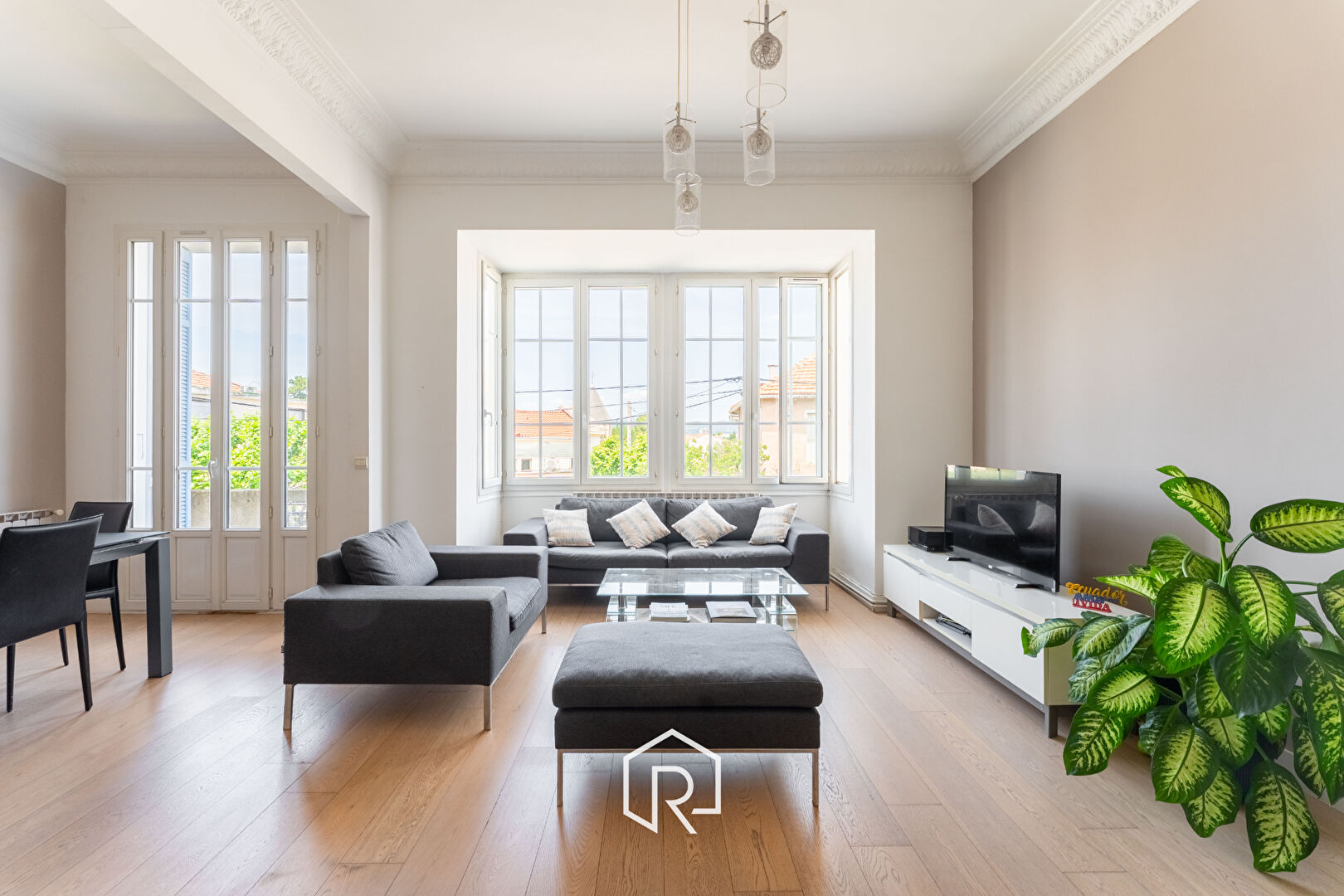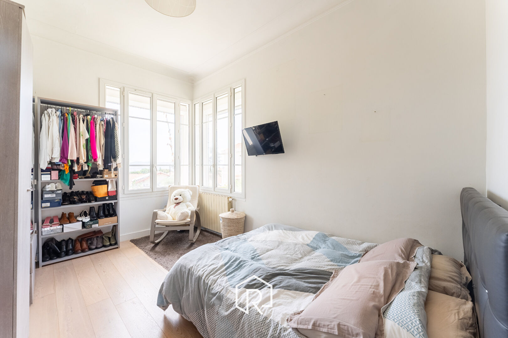 A l'étage, un vaste appartement de type 4/5 de 121 m² occupe tout le plateau. Baigné de lumière, il se compose d'une remarquable pièce de vie, d'une grande cuisine séparée, de trois chambres de très belles dimensions, d'une salle de bains, d'une salle d'eau et d'un WC indépendant. Une véranda complète ce niveau offrant une vue dégagée sur les collines.